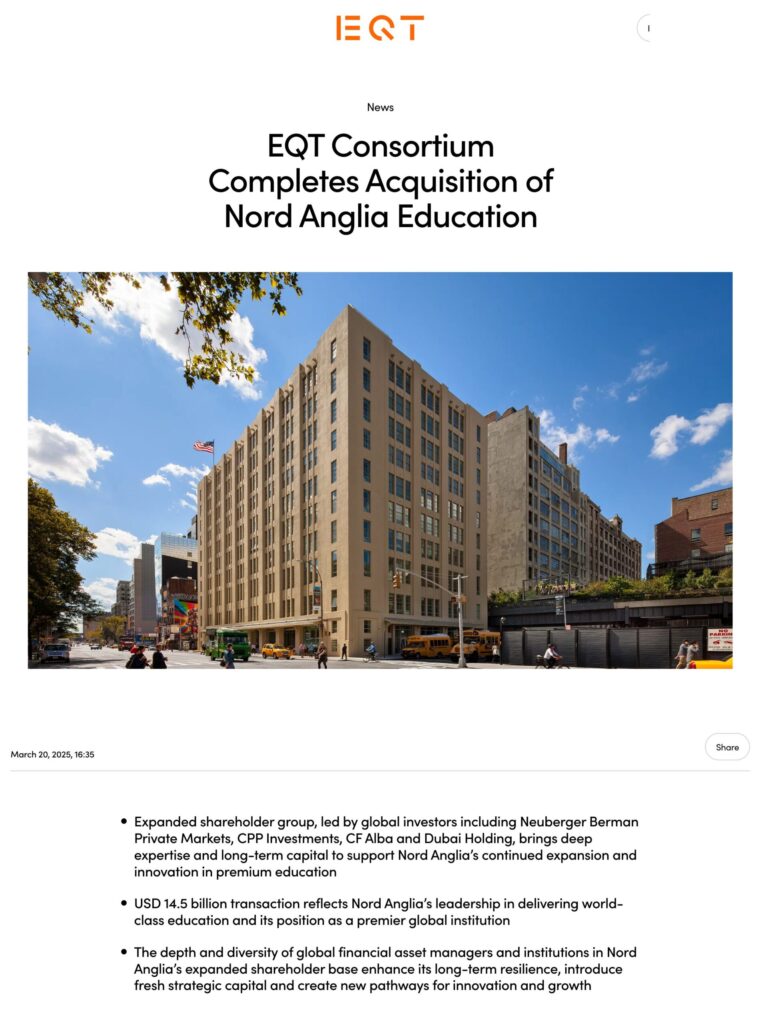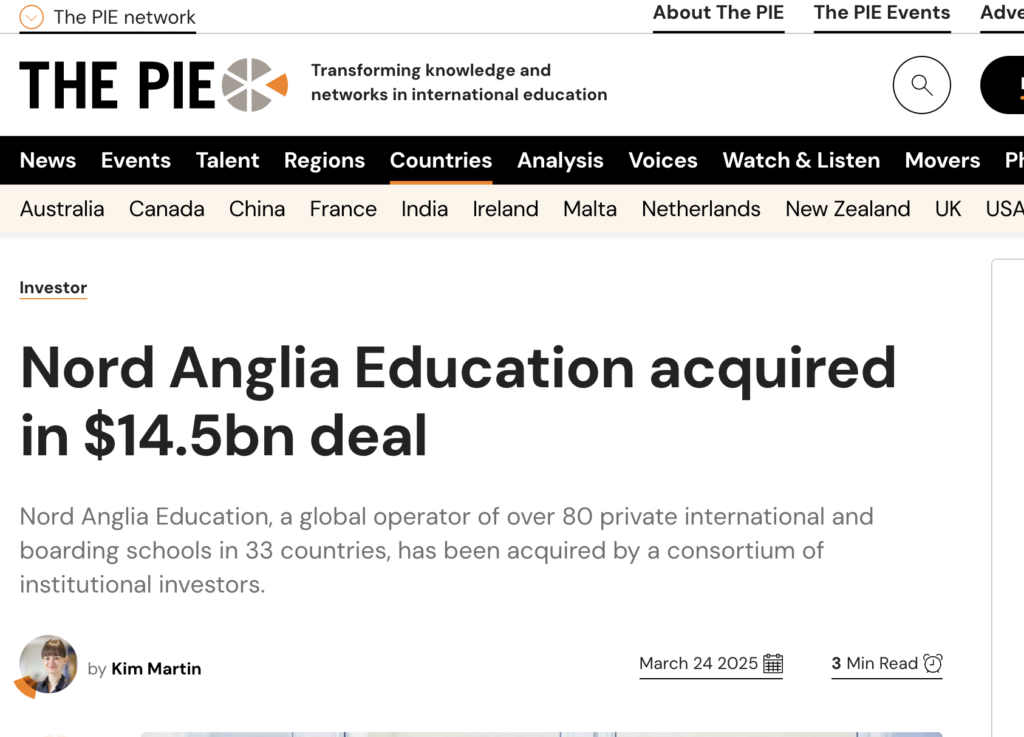2025年にインターナショナルスクール業界で話題になったのが、世界でインターナショナルスクールを運営するNord Anglia Educationが、約2兆円(約145億ドル)規模で出資を受けた案件である。
